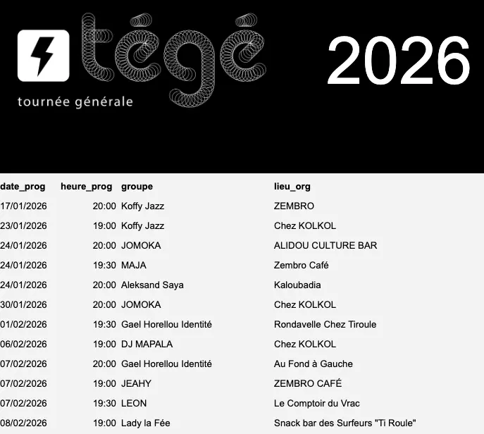 Voir les dates inscrites dans le cadre du dispositif Tégé 2026Pour toute question et assistance dans vos démarches, lékip Tégé se tient à votre disposition :